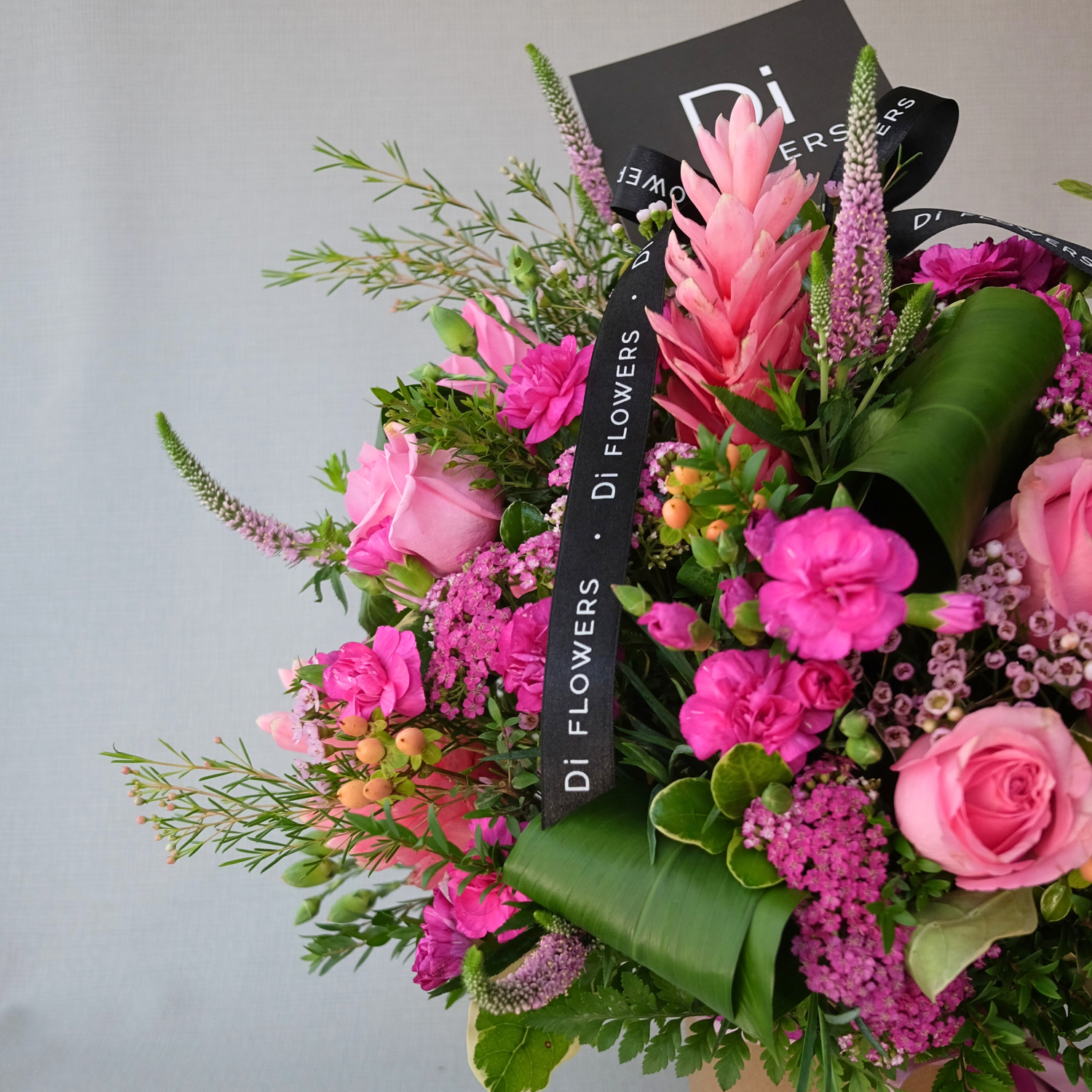 Box en color natural con: 15 rosas rosadas, 5 ginger rosado, claveles, wax, achilea, hipérico y diversos follajes.