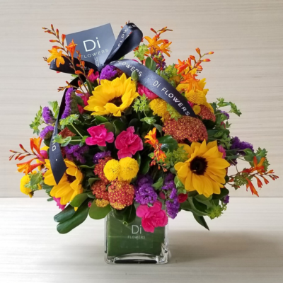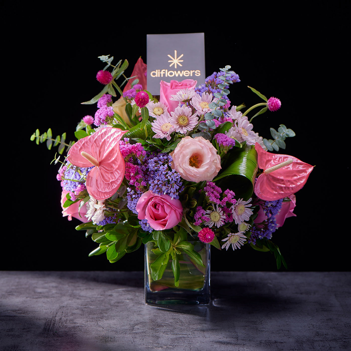 Cubo de vidrio de 10x10x10cm con 5 rosas,
