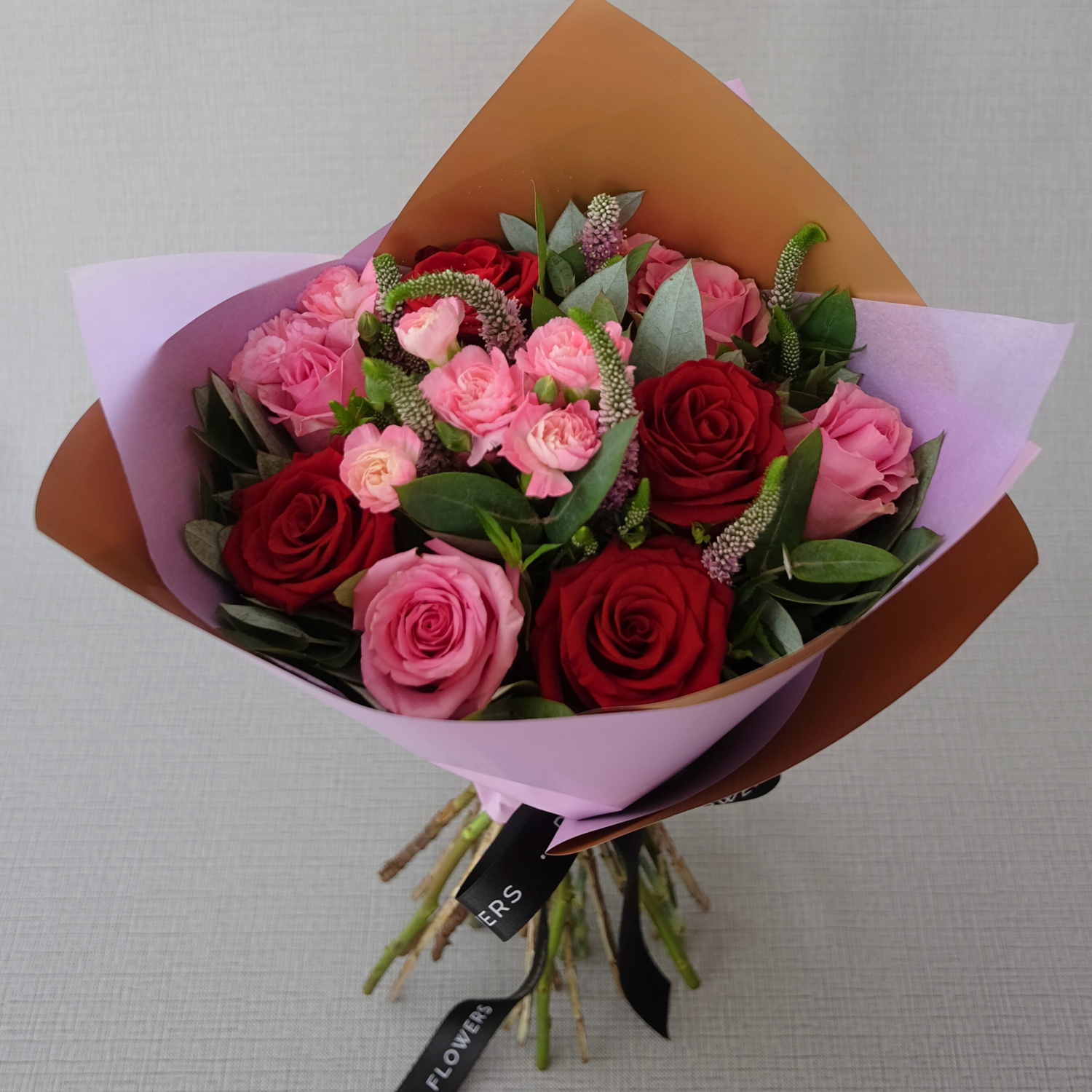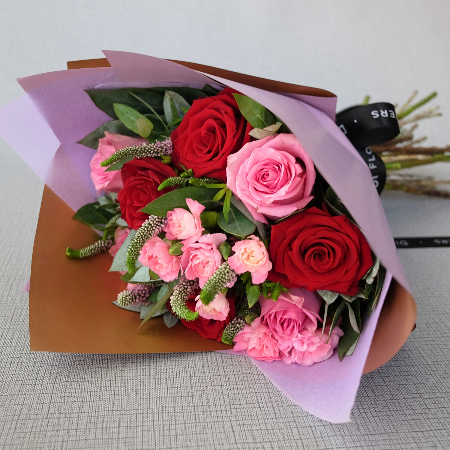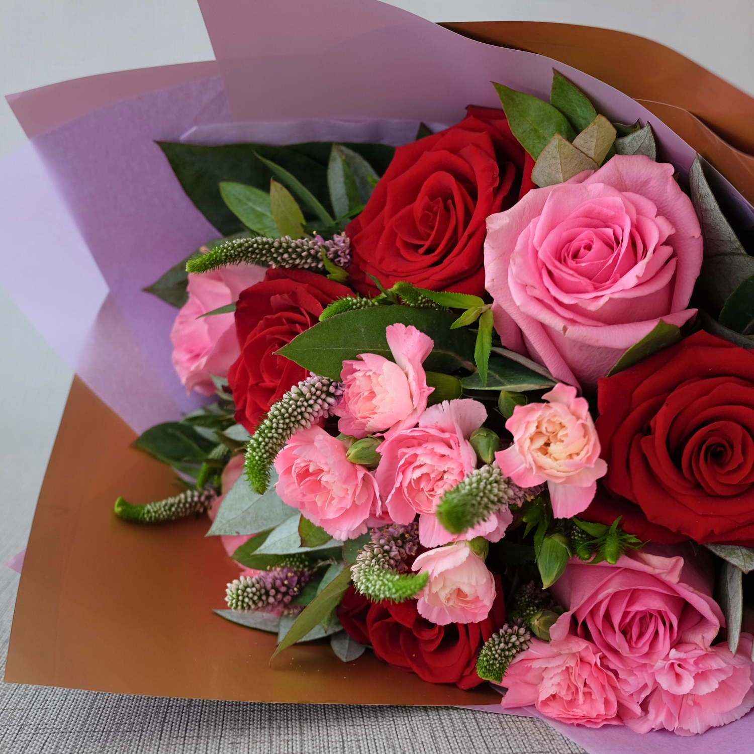 Ramo con 4 rosas rojas, 4 rosas rosadas, clavel rosado y diversos follaje. Envuelto en papel coreano lila.