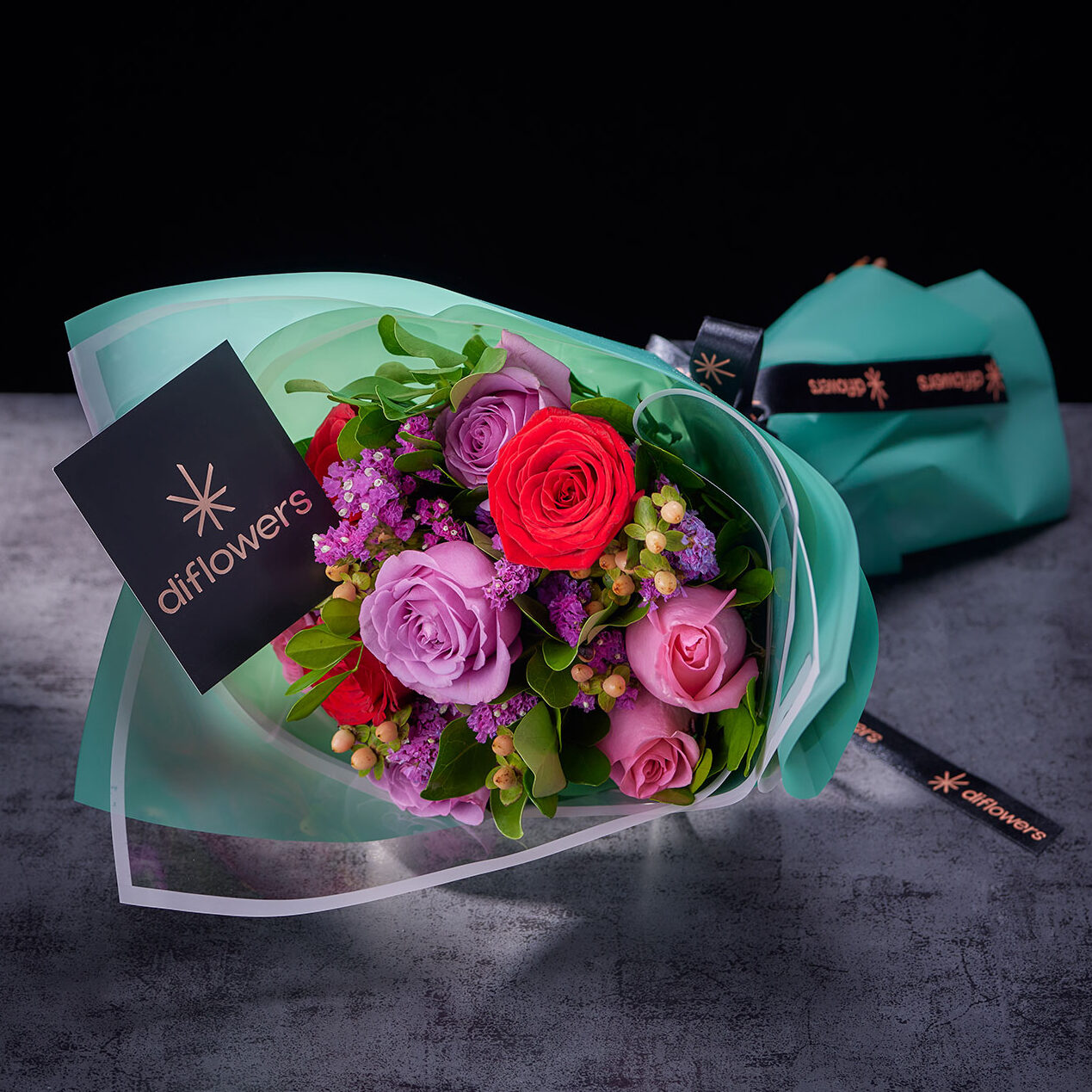 Ramo con 9 rosas, statice, hipérico y diversos follajes, envuelto en papel coreano.